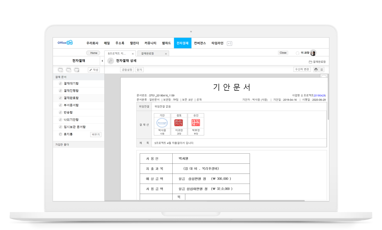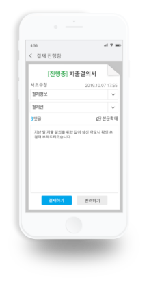 다양한 결재문서 양식을 제공하고 이전 문서를 활용한 재작성이 가능하며 모바일로 승인할 수 있습니다.
