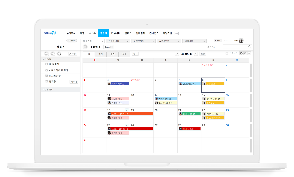 오피스온 캘린더를 통해 담당자를 지정하고 자료를 첨부하여