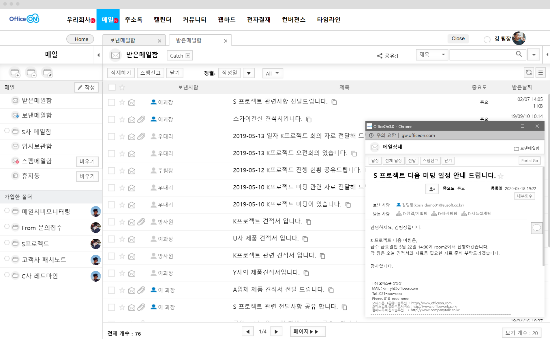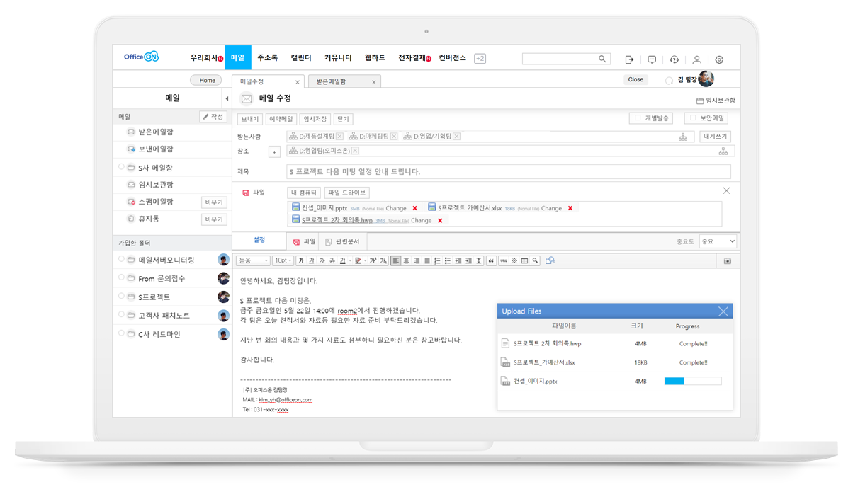 다양한 메일을 분류별로 관리하고 대용량 메일과 예약 메일 기능을 이용하여 비즈니스 메일을 쉽게 작성할 수 있습니다.