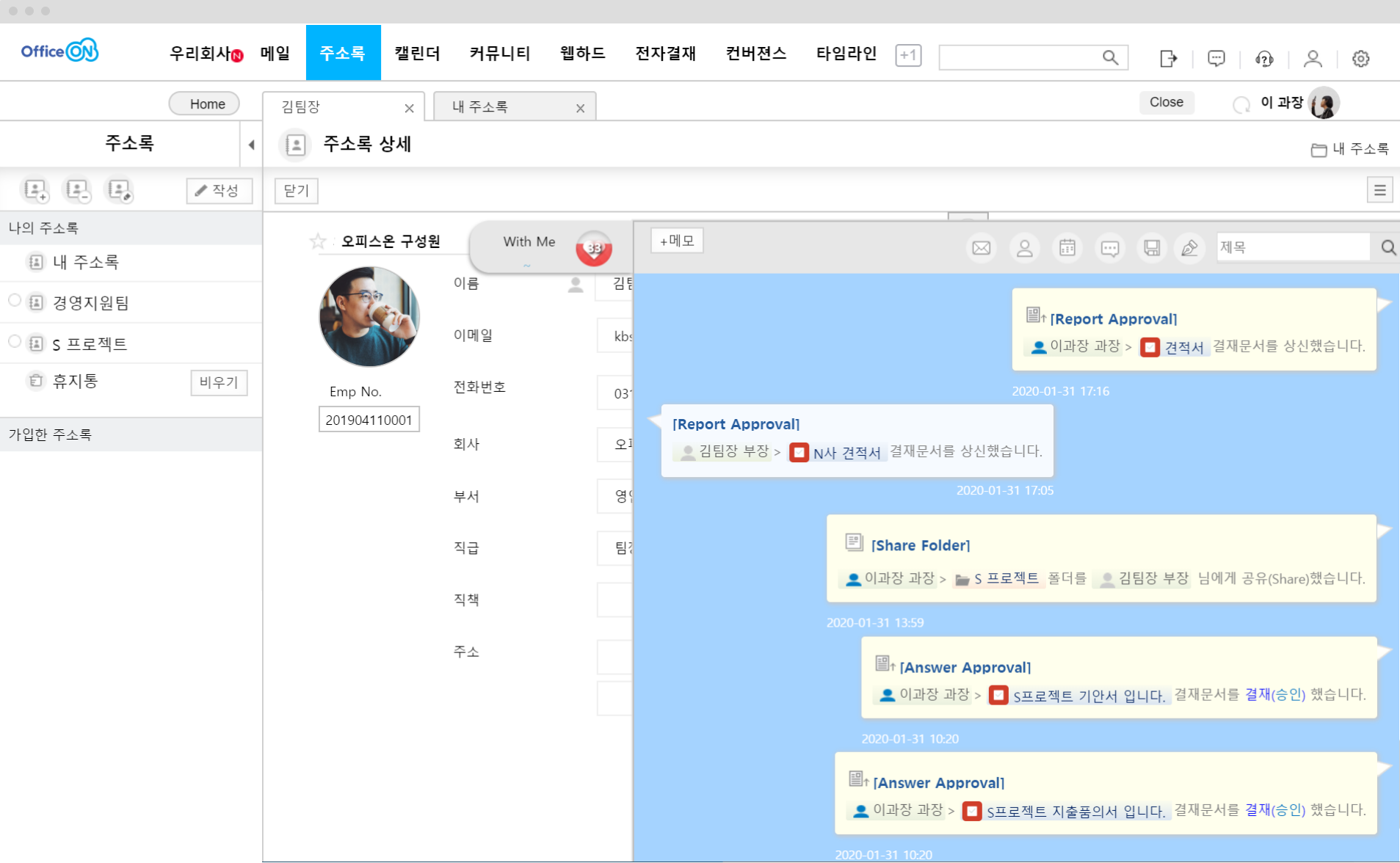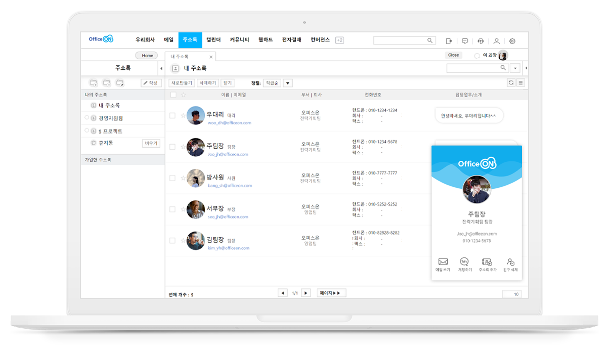개인, 부서, 회사 주소록을 지원 및 손쉬운 관리가 가능합니다.