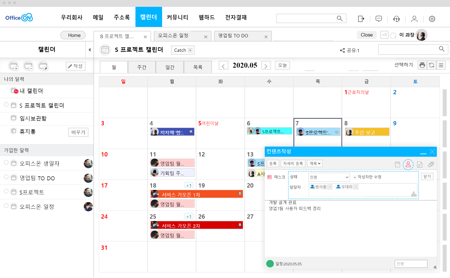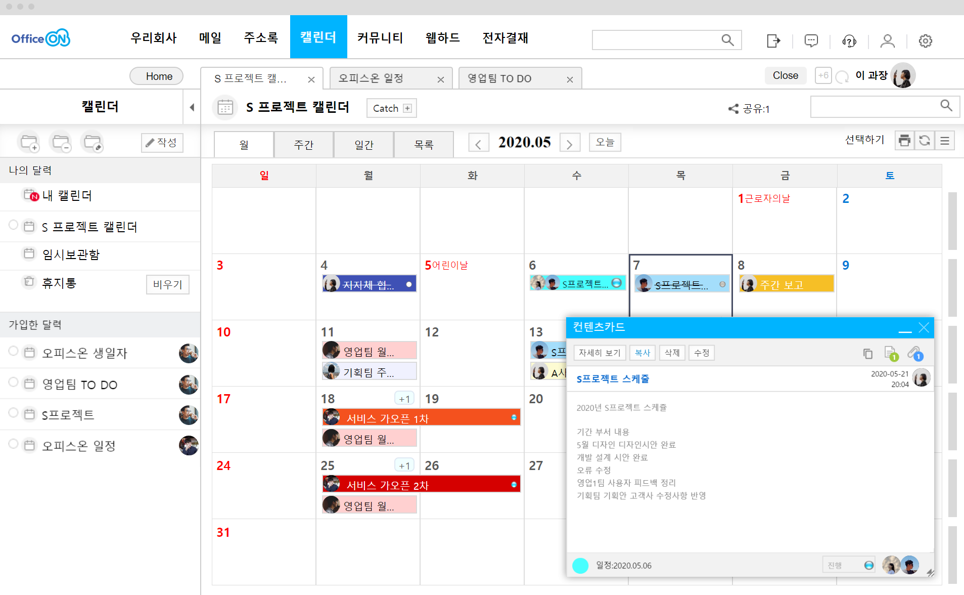 개인, 부서, 회사 캘린더를 지원하며 모두 모아 한곳에서 관리가 가능합니다.