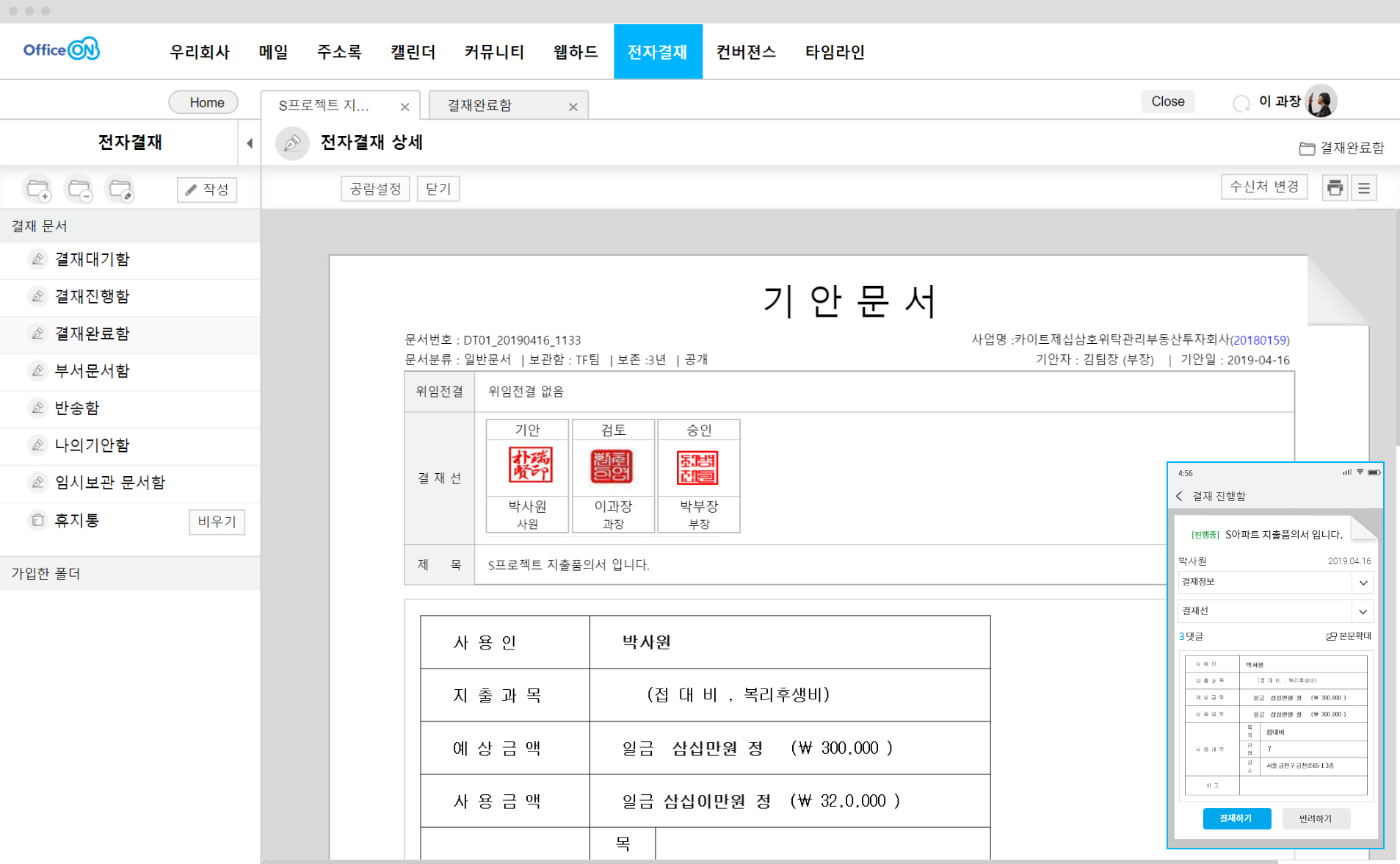 사무실 밖에서도 비대면으로 모바일을 사용하여 결재 승인을 할 수 있습니다.