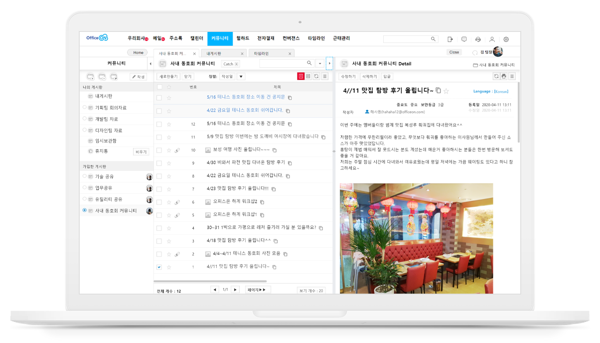 다양한 게시판을 만들고 운영할 수 있고 공지사항을 등록하면 실시간 알림이 갑니다.