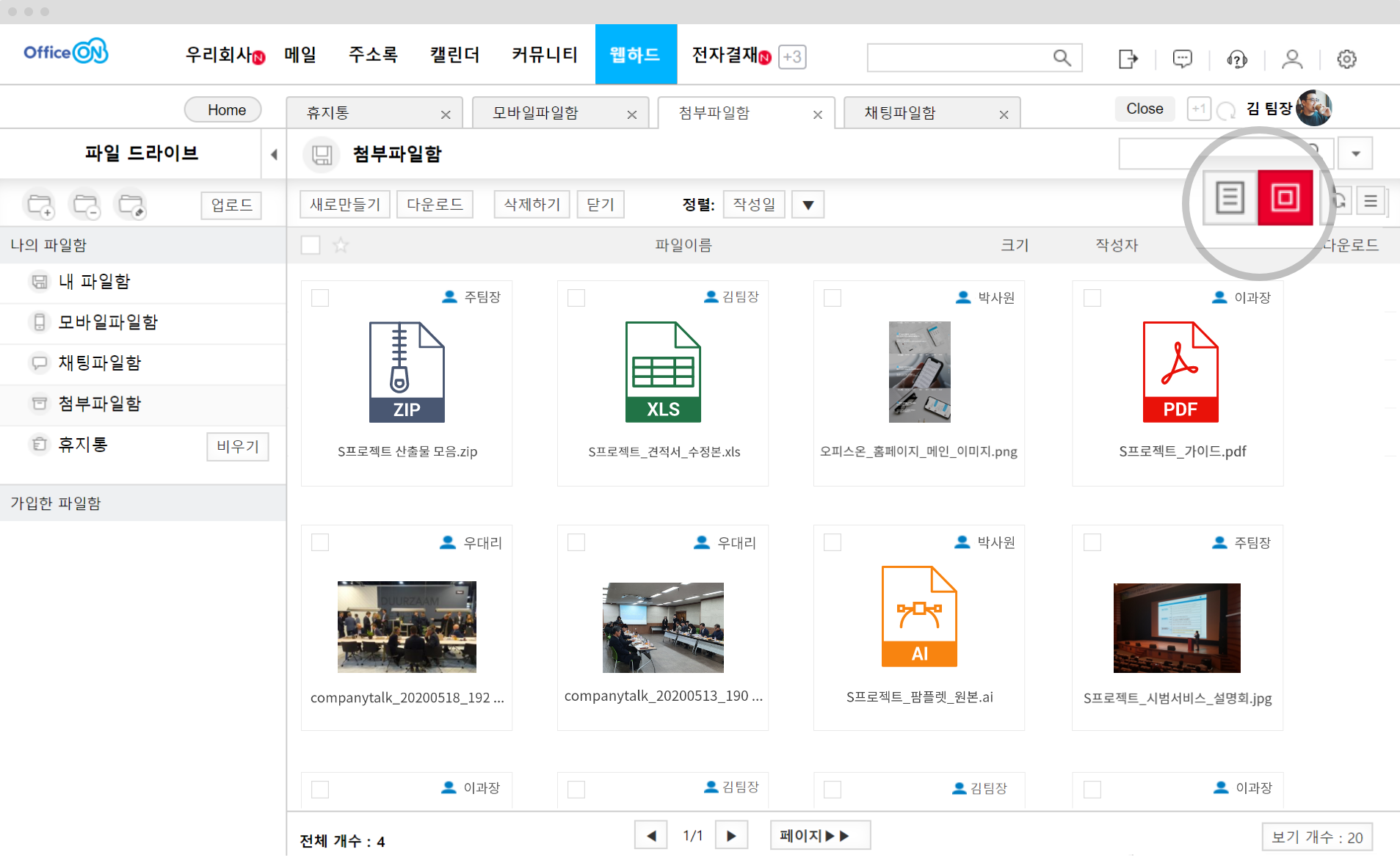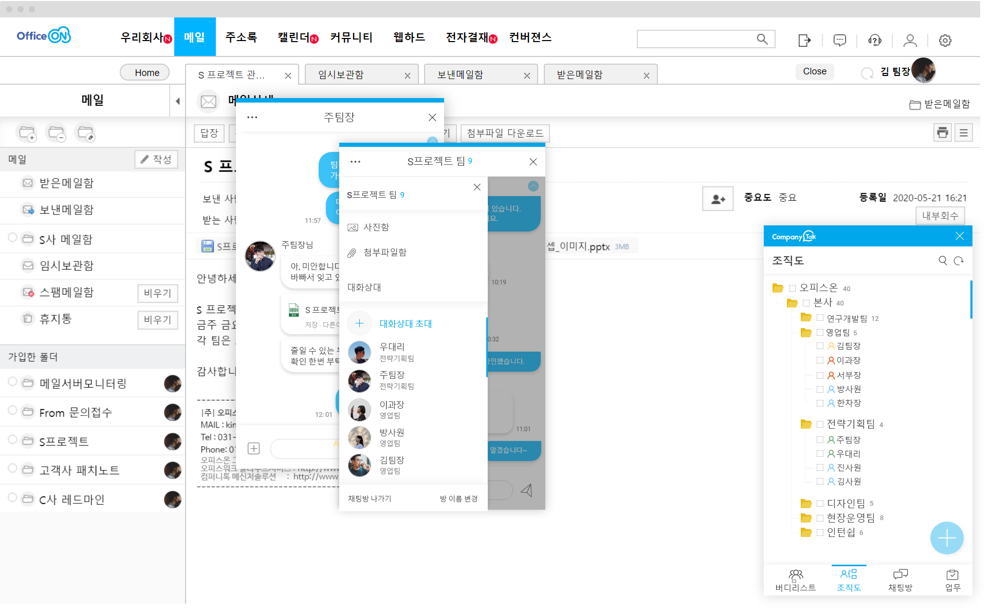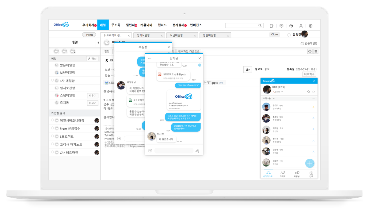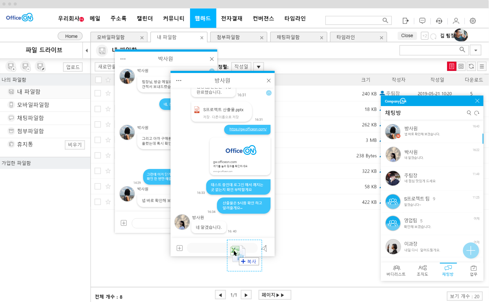 오피스온은 PC, 모바일, 웹 메신저를 지원하며 주고 받은 파일 및 이미지는 채팅파일함에 자동으로 저장됩니다. 오피스온으로 소중한 회의 내용을 하나도 놓치지 마세요.