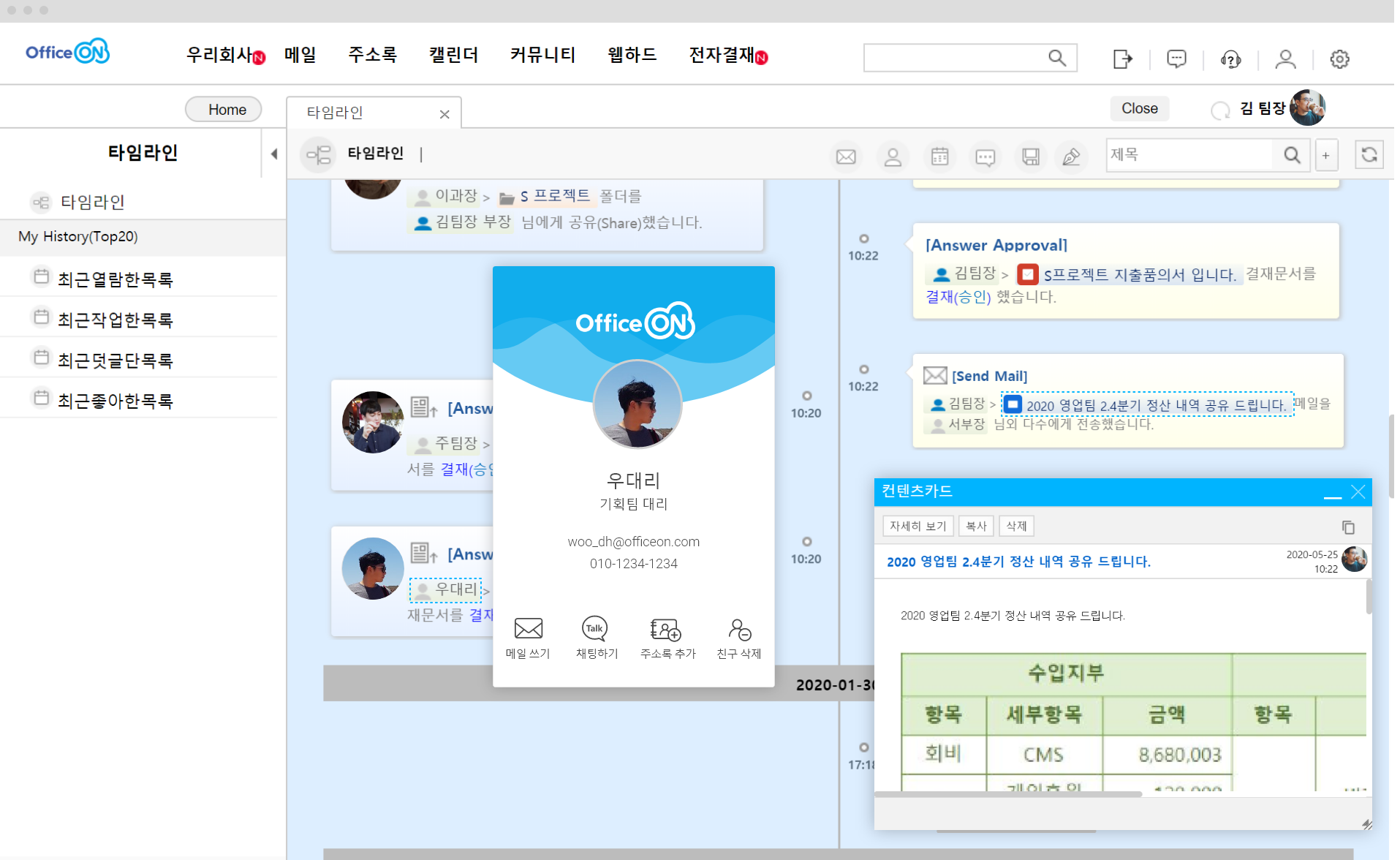 주고 받은 컨텐츠를 시간순으로 정렬 및 조회 가능하여 다른 컨텐츠에서 업무를 찾을 필요가 없습니다.
