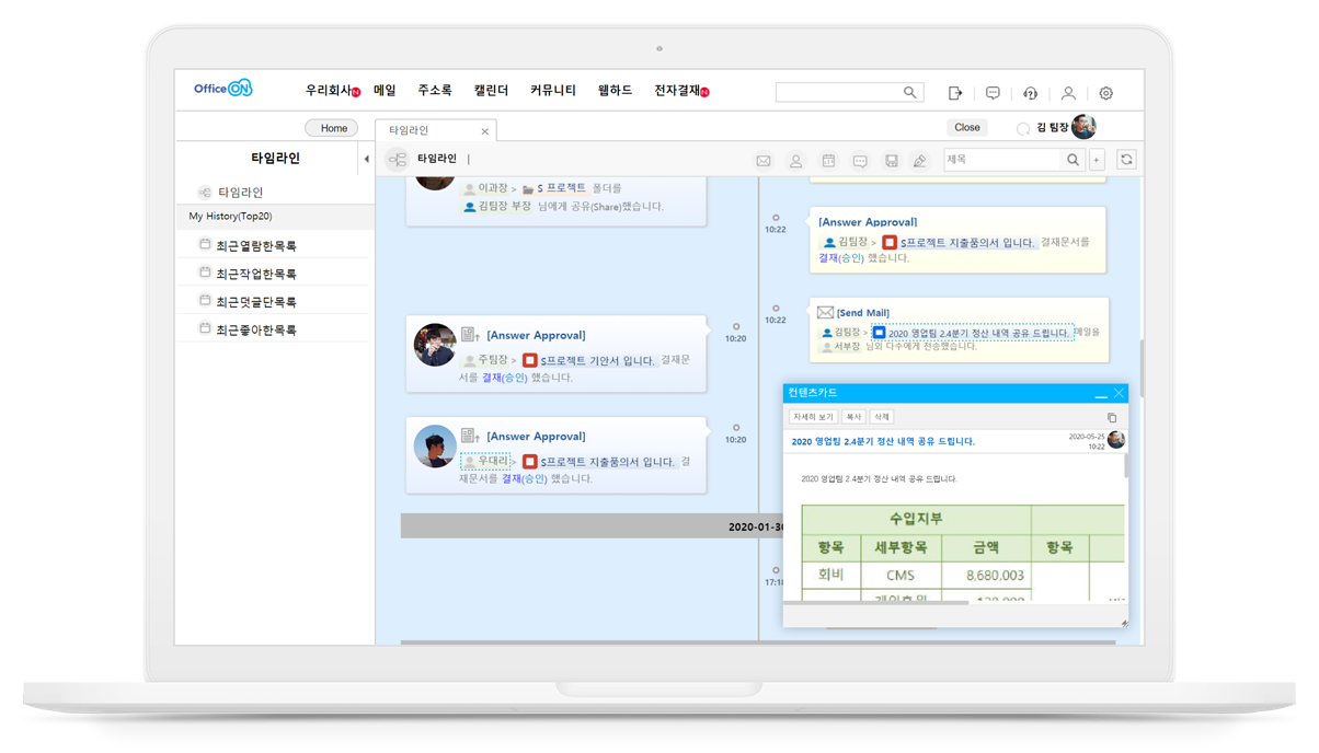 게시판, 메일, 전자결재, 파일 등 종류다 모두 다른 콘텐츠를 한 곳에 담을 수 있습니다