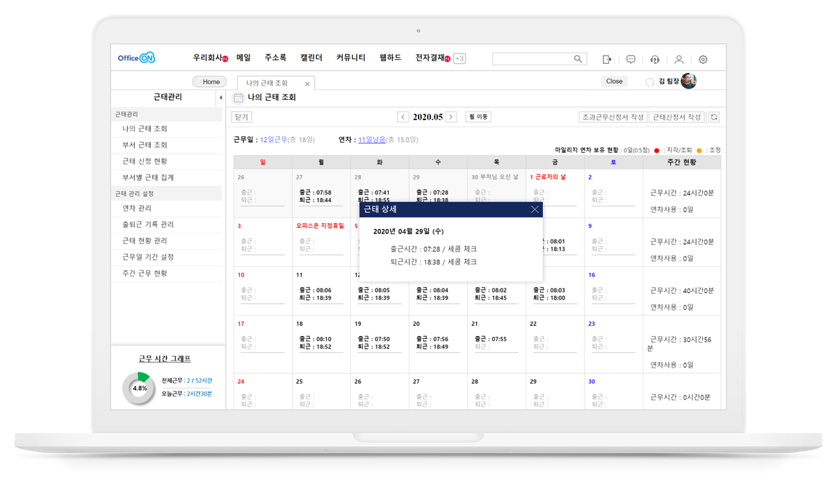 연차, 출/퇴근시간 관리, 근태신청현황, 근무요일 관리, 주근근무현황 등 체계적인 근태관리를 할 수 있습니다.