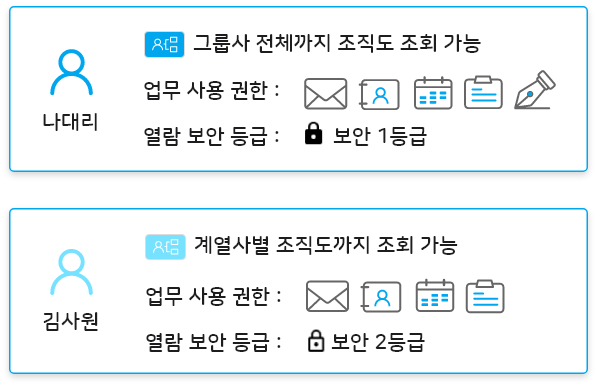 직급에 따른 조직도 접근의 권한을 구성원마다 다르게 부여하여 체계적이며 손쉽게 관리할 수 있습니다.