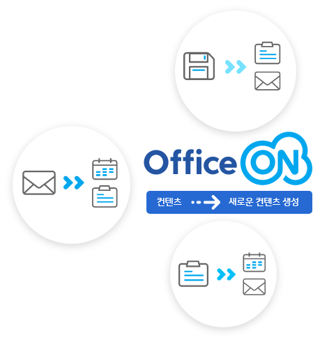 오피스온 그룹웨어 안에서 모든 컨텐츠는 업무에 제한 없이 다른 컨텐츠 작성에 모두 활용될 수 있습니다. 메일을 이용한 일정등록, 게시글을 통한 결재문서 작성 등 컨텐츠를 활용한 새로운 컨텐츠 작성을 가능하게 하며, 기존의 작성된 컨텐츠의 낭비를 줄여 활용도를 높였습니다.