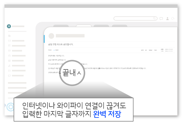 열어 놓은 페이지는 물론, 작성하던 텍스트까지 사용자가 했던 마지막 행위 모두가 서버에 자동 보관되어 관리됩니다. 갑작스런 정전이나 실수로부터의 손실을 예방하도록 도와줍니다.