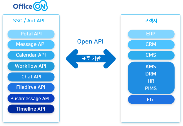 통합 메시징 API, 모닝레터 API, HR API, Calendar API, Filedrive API, Timeline API 등 기업의 다양한 시스템과 손쉽게 연계를 할 수 있도록 오피스온은 Open API가 준비되어 있습니다.