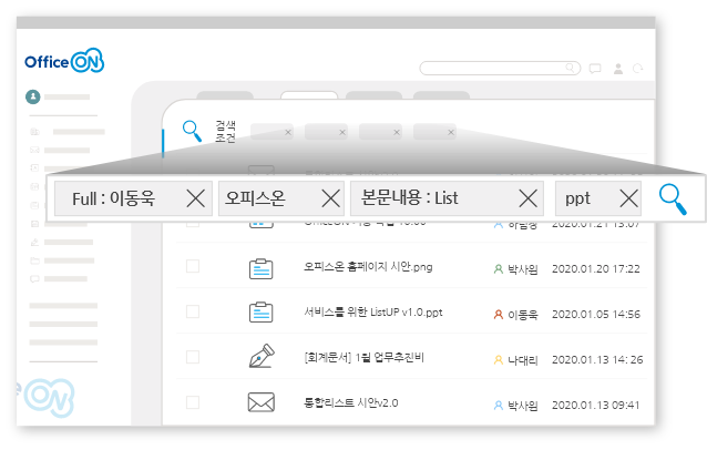 그룹웨어 내 모든 컨텐츠를 통합 검색을 지원하는 막강한 검색 엔진으로 결과 내 재검색을 지원하여 원하는 정보를 짧은 시간으로 검색이 가능합니다.